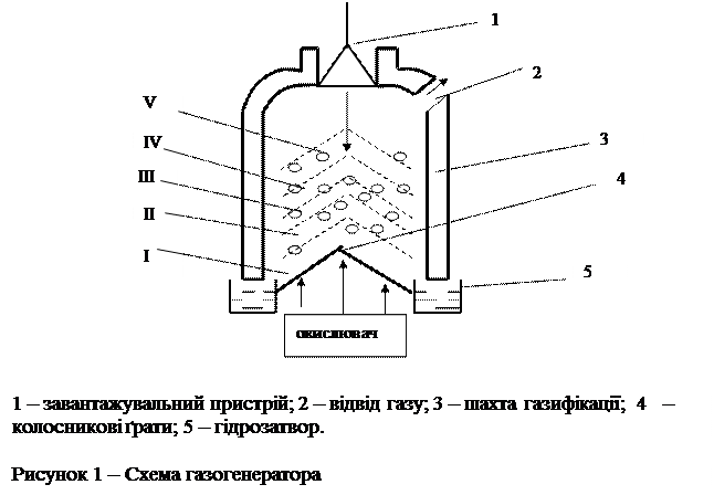 Газифікація – термохімічний процес переробки твердого палива шляхом приєднання до нього кисню для перетворення твердого палива в газ, що горить і може бути застосований для наступного спалювання (енергетичний і побутовий газ) чи для технологічних цілей (технологічний газ). В основі газифікації лежить або неповне горіння палива (при недоліку кисню), або повне горіння з наступним реагуванням вуглецю з вуглекислотою чи водяною парою з метою одержання газів, що горять. Найпростіший спосіб газифікації представлений на рисунку 1. Шматки палива надходять зверху через завантажувальний пристрій; знизу через зазори в чавунних колосникових ґратах подаються повітря і водяна пара. У нижній частині шару II, що розташована над зоною золи і шлаку I, відбувається неповне горіння палива при недоліку кисню. Тому що в цій зоні витрачається майже весь О2, її називають кисневою. Зона золи і шлаку I, що примикає безпосередньо до колосникових ґрат, відіграє роль засипки, що вирівнює розподіл дуття і захищає колосники від перегріву. Продукти неповного горіння вуглецю, що містять у більшій кількості СО2 і в меншій СО надходять до зони відновлення III. Тут вуглекислота і водяна пара вступають у реакцію з вуглецем коксу, розпеченого за рахунок тепла, що виділилося в кисневій зоні. У результаті реакцій СО2 і Н2О з вуглецем палива утворяться СО і Н2, до яких домішується азот повітря і нерозкладена частина СО2. Суміш газів, що утворилася, йде вгору через шар палива і нагріває його своїм теплом. Нагріте без доступу кисню при температурі 500-600°С, паливо перетерплює складні видозміни своєї внутрішньої структури, що називаються сухою перегонкою чи напівкоксуванням. При цьому відбувається виділення летких газів, які приєднуються до потоку газів, що йде з зони відновлення. За рахунок тепла, що залишилося, у верхній частині шару паливо підсушується і до газів приєднуються водяні пари в зоні сушіння V. Генераторний газ, що утворився, відводиться через газовідводний патрубок. Непальні залишки у виді шлаку віддаляються з колосникових ґрат у ванну з водяним затвором. Розподіл простору газогенератора на зони є чисто умовним, тому що процеси в ньому йдуть паралельно і можуть накладатися один на одного. У залежності від складу дуття генераторні гази поділяють на 4 групи: 1. Повітряний. 2. Водяний. 3. Змішаний. 4. Парокисневий.