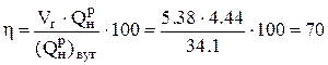 де QCO, QH2 – теплоти згоряння окису вуглецю і водню, МДж/м3. ККД газифікації, %: