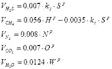 В якості летких газів при термічній переробці твердого палива при високих температурах процесу виділяються наступні гази: H2S, CH4, N2, CO2, H2O. Їх вихід (м3/кг) можна обчислити за наступними формулами: