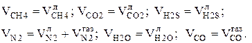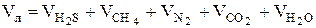 де H2Sл, CH4л, N2л, CO2л, H2Oл – відсотковий вміст відповідних компонентів в летких визначається як відношення об’єму відповідного компоненту летких до загального об’єму летких: