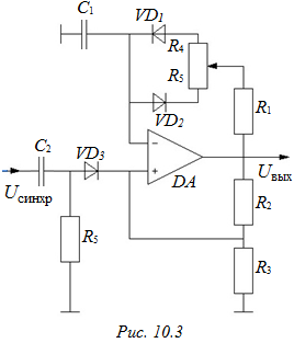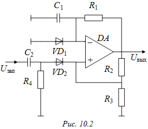 При одной из полярностей выходного сигнала диод открыт, емкость разряжена, f − = 0 (при включении диода в соответствии со схемой такое состояние наблюдается при − Е). Так как при этом f + = − ЕR 3/(R 2 + R 3), то регенеративный компаратор и весь мультивибратор находятся в устойчивом состоянии. Вывести схему из устойчивого состояния можно лишь подачей импульса положительной полярности с амплитудой U зап > ЕR 3/(R 2 + R 3). Тогда на короткое время полярность потенциала f + поменяется на противоположную, а этого достаточно для изменения полярности выходного сигнала мультивибратора. При этом диод VD 1 закрывается и начинается заряд емкости С 1 через сопротивление R 1 и увеличение f −. По достижении f − = f + = +ЕR 3/(R 2 + R 3) компаратор переключается, на этот раз без подачи внешнего сигнала, самопроизвольно. Схема возвращается в исходное состояние по выходу. Завершается процесс восстановления быстрым разрядом емкости С 1 через вновь открывшийся диод VD 1. Цепь запуска состоит из дифференцирующей цепи С 2– R 4, служащей для укорочения входного воздействия, и диода VD 2, исключающего поступление на вход ОУ обратного выброса сигнала, образующегося после дифференцирования. Подача следующего запускающего импульса допустима лишь после восстановления исходного состояния ждущего мультивибратора.