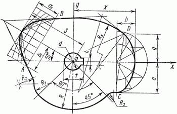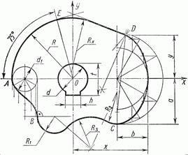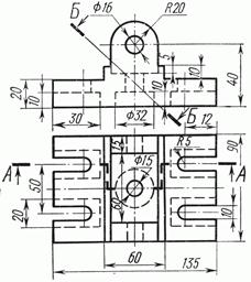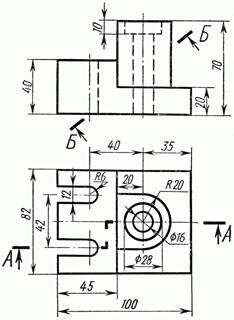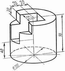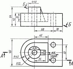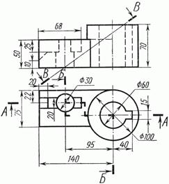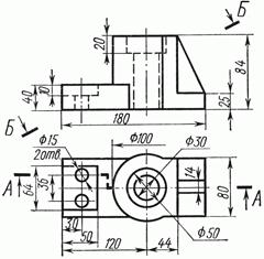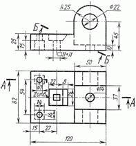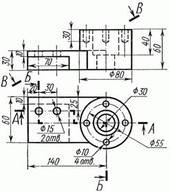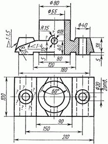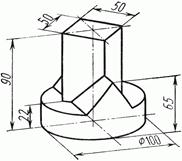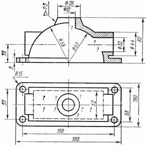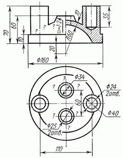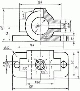 Построить по двум изображениям детали третье с «полезными» разрезами. и линии перехода. Пример выполнения дан на рисунке 3.8. Варианты задач показаны в приложении Г. В индивидуальных заданиях линии перехода проведены не полностью, а лишь начало и конец их, и поставлены знаки вопроса. Для нахождения точек линий пересечения двух поверхностей (линии перехода) нужно выбрать наиболее рациональный способ решения. Следует по возможности подбирать такие вспомогательные поверхности – посредники (плоскости или сферы), которые пересекаются с данными поверхностями по графически простым линиям (например прямые линии, окружности). Каким бы способом не проводились построение линий пересечения, нужно сначала найти характерные или «опорные» точки искомой кривой. К ним относятся: точки, проекции которых лежат на проекциях очерковых линий одной из поверхностей (например, на крайних образующих цилиндра или конуса, на главном меридиане и экваторе шара), отделяющие видимую часть линии пересечения от невидимой; «крайние точки» - правые и левые, наивысшие и наинизшие, ближайшие к наиболее удаленные от плоскостей проекции. Все остальные точки линии пересечения поверхностей называются промежуточными.