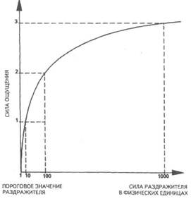 Рис. 35. Логарифмическая кривая зависимости величины ощущения от силы раздражителя, иллюстрирующая закон Вебера—Фехнера