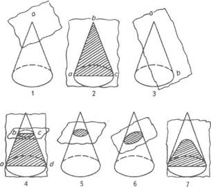 щиеся данного вида мышления. С самого начала отметим, что творческое мышление не обязательно связано только с одним из обсуждавшихся ранее видов мышления, скажем, словесно-логическим; оно вполне может быть и практическим, и образным. РАрнхейм отмечает, что видеть свойства какого-либо предмета — значит воспринимать его как пример воплощения определенного общего понятия, что всякое восприятие состоит в выделении ранее абстрагированных черт. «Следовательно, абстрактное содержится не только в мышлении, но и в других познавательных процессах»1. Ярким примером необходимости наглядно-образных представлений для более глубокого понимания абстрактных вещей и понятий может служить следующий пример. Оказывается, что такие различные геометрические понятия, как точка, прямая, треугольник, трапеция, окружность, эллипс, парабола, которые благодаря подкупающей простоте и законченности строения считались абстракциями, не зависящими от реальности, на самом деле связаны с ней и с конкретно-образными представлениями. Рисунок 52 наглядно демонстрирует, что все эти абстракции можно «увидеть» на различных сечениях плоскостью обыкновенного конуса. Точка получается, если плоскость проходит через вершину конуса (52.1); треугольник образуется при пересечении плоскостью конуса по его оси (52.2); отрезок прямой линии можно получить, если плоскость проходит как касательная к боковой поверхности конуса (52.3); трапеция образуется в случае, если от треугольника, образуемого сечением 52.2, отделяется верхняя часть при помощи плоскости, параллельной основанию (52.4); круг можно получить, сделав поперечное сечение конуса плоскостью, параллельной основанию (52.5), эллипс образуется таким же сечением, но проведенным под наклоном (52.6); парабола вырисовывается в случае, если секущая плоскость проходит параллельно оси конуса, но не через ее саму (52.7). Таким образом, меняя расположение и взаимную ориентацию конуса и секущей плоскости, можно не только получить ряд фигур, выражающих абстрактные понятия, но и незаметно, в наглядно-действенном плане переходить от одного абстрактного понятия к другому. По этому поводу Р.Арнхейм пишет, что элементы мышления в восприятии и восприятия в мышлении взаимно дополняют друг друга. «Они превращают человеческое познание в еди- ^Арнхейм Р. Визуальное мышление // Хрестоматия по общей психологии: Психология мышления. — М., 1981. — С. 98.