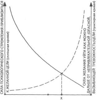 Рис. 84. Гипотетические кривые, выражающие стремление одного человека к другому, который одновременно опасен и привлекателен для него. Сплошная кривая — сила желания приблизиться к объекту; пунктирная — удалиться от него. X — точка, где желания сблизиться и удалиться уравновешиваются. В ней и находится человек в состоянии конфликта стрируемым воспринимается как причина его неудачи. Вот один из примеров действия фрустрации на поведение детей в группе, взятый из исследования, проведенного в начале 40-х годов известным социальным психологом К. Левином совместно с Р.Бар-кер и Т.Дембо. Эксперимент, о котором идет речь, проводился с детьми дошкольного возраста в течение нескольких дней. В первый день детям была предоставлена возможность играть в комнате с разными игрушками, причем все они были некомп-