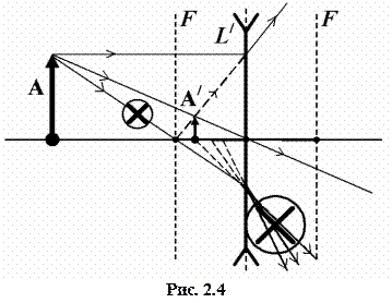Волна, выходящая из точки в фокальной плоскости собирающей линзы, после линзы становится плоской (пучок параллельных лучей на рис.2.2 в) по этому признаку можно определить фокусное расстояние собирающей линзы. На практике, при конструировании и проектировании различных оптических приборов (систем), например, таких как микроскопы, бинокли, зрительные трубы, телескопы и ряд других, часто возникает необходимость проводить геометрическое построение хода лучей, источниками которых могут являться различные объекты. При этом, если оптическая система содержит значительное число линз, то построение изображение производится поэтапно: сначала ход лучей от объекта, являющегося первоисточником света, рассматривают только в одной, самой первой линзе по ходу лучей, получая первое изображение от нее, затем даваемое ею изображение (действительное или мнимое) рассматривают как источник для второй линзы, рассматривая ход лучей через вторую линзу и получают второе изображение и затем повторяют процесс до тех пор, пока не получат окончательное изображение, даваемое последней линзой в оптической системе. При построении хода лучей через собирающую линзу L (см. рис. 2.3) используют наиболее «удобные» лучи. Так, например, если объект находится перед собирающей линзой, то такими удобными лучами могут быть любые два луча из трех следующих: 1- луч, идущий от объекта через оптический центр линзы (он не преломляется); 2- луч, идущий параллельно главной оптической оси линзы (преломившись, он пройдет через второй фокус линзы); 3- луч или его продолжение (для объекта В на рис. 2.3), прошедший перед линзой через ее первый фокус (такой луч после преломления пойдет параллельно главной оптической оси). Изображение какой-либо точки объекта получается на пересечении любых двух лучей из 3-х указанных (если объект находится перед фокусом) или на продолжении преломленных лучей (если объект находится между плоскостью линзы и ее фокальной плоскостью).