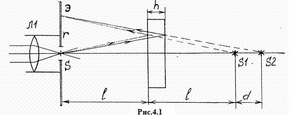 Пусть излучение точечного источника S, сформированного линзой Л1, (рис.4.1), отражается от плоскопараллельной пластины П. Волны, отраженные от передней и задней поверхностей пластины, дают на экране Э интерференционную картину в виде концентрических темных и светлых колец с центрами на оси пучка. Эту картину можно рассматривать как результат сложения волн, испущенных источниками S 1 и S 2, являющимися изображениями источника S в передней и задней поверхности пластины. Расчет радиуса r к кольца, соответствующего k-му порядку интерференции при условии r к < l и h < l приводит к выражению: r к2 = l 2 (8 n 2 - k ×4 n l0/ h) (4.1) Из (4.1) следует, что r k2 линейно зависит от k. Пронумеровав последовательно кольца, получим линейную зависимость r k2 от номера кольца N. Угловой коэффициент графика зависимости r k2 от N: