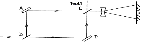 Интерферометр (рис.6.1) состоит из четырех зеркал: полупрозрачных В и С и глухих А и D. Входящий световой пучок расщепляется полупрозрачным зеркалом В на два пучка равной интенсивности, которые после отражения сводятся вместе вторым полупрозрачным зеркалом С. На выходе имеются две плоские световые волны, распространяющихся в близких направлениях. Если зеркала установлены так, что выходящие пучки абсолютно параллельны, то может случиться, что эти две волны находятся в противофазе. Тогда результирующая интенсивность будет равна нулю. При этом вся энергия будет уноситься идущим вверх пучком (он показан пунктиром на рис.6.1). Обычно выходящие пучки не абсолютно параллельны, и наблюдается интерференционная картина в виде системы из параллельных полос (см.рис.6.2). Диаметр пучков мал (менее 1 мм), и наблюдать картину невооруженным глазом невозможно. Для увеличения размеров интерференционной картины на пути двух пучков помещают рассеивающую или собирающую линзу с малым фокусным расстоянием. Тогда на экране получается интерференционная картина, приемлемых размеров (размер пятна на экране относится к диаметру пучка, как расстояние до экрана относится к фокусному расстоянию линзы).