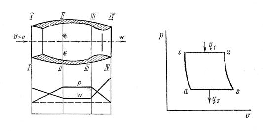 где Как Области скоростей полета, целесообразных для применения прямоточного двигателя, лежат в диапазоне скоростей, в 2 и более раза превышающих скорость звука. В ПуВРД для осуществления процесса горения топлива при постоянном объеме необходимо в сечениях II-II и III-III (рисунок12.1) поставить клапаны, которые при горении топлива разобщат камеру сгорания от входного диффузора и реактивного сопла. Впрыск топлива должен осуществляться периодически, когда эти клапаны будут закрыты. На рисунке 12.3 изображен в р-v – диаграмме цикл пульсирующего ПуВРД,