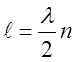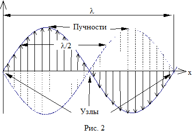 Пусть две плоские монохроматические волны с одинаковыми амплитудами и частотами, распространяются навстречу друг другу вдоль оси OX. Тогда возмущение в точке x в момент времени t будет суммой возмущений от каждой из волн: y = A×[cos (k×x – w×t) + cos (k×x + w×t)]=2Acos(kx)×cos(wt). Как видим, результирующее возмущение уже не представляет собой волны, а является в каждой точке просто колебательным процессом с частотой w. При этом амплитуда колебаний зависит от координат: A(x)=2A×cos(kx) (5). Поскольку никакого распространения колебаний здесь нет, то такой процесс называют стоячей волной. Точки, в которых наблюдается максимум амплитуды колебаний в стоячей волне, называют пучностями стоячей волны, а точки, где амплитуда равна нулю – узлами волны. Расстояние между соседними пучностями соответствует половине длины волны. Точно также половине длины волны соответствует расстояние между соседними узлами. В точках, отстоящих одна от другой на расстояние в половину длины волны, колебания происходят в противоположных направлениях, или в противофазе. Все сказанное иллюстрируется рисунком 2, где стрелками указаны величины возмущений в различных точках стоячей волны в некоторый момент времени. Стоячие волны легко наблюдать при колебаниях струны, если выполнены условия возникновения стоячей волны. В частности, амплитуда колебаний на концах закрепленной струны равна нулю. Если длина струны равна ℓ, то, очевидно, kℓ=p×n, где n - любое целое. Поскольку k=2p/l, то условие возникновения стоячей волны можно записать как Стоячие волны можно наблюдать также при распространении звуковых волн в стержнях, волнах на поверхности жидкости в сосуде, звуковых волнах в трубах и т.п.