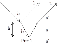 Формула (3) написана для случая, когда показатель преломления среды, вне пленки, n’ = 1. Слагаемое l/2 в (3) объясняется появлением у волны, отраженной от оптически более плотной среды (среды с большим показателем преломления) добавочной фазы, равной p. Если пленка достаточно тонка, то волны 1 и 2 – когерентны (см. Введение). Поэтому, в зависимости от разности хода, они усиливают или ослабляют друг друга, создавая определенную интерференционную картину.