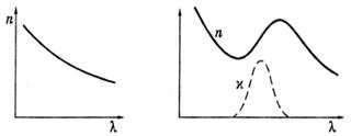 Тот факт, что показатель преломления является комплексной величиной, означает, что световая волна в среде затухает по мере распространения вглубь среды, и скорость затухания определяется мнимой частью показателя преломления . Когда частота световой волны w близка к одной из собственных частот wk, то величина делается большой. В этом случае говорят, что вблизи wk имеется полоса поглощения. Кроме того, как следует из (2), вблизи wk вещественная часть показателя преломления n убывает с ростом частоты w (или, что то же самое, растет с ростом длины волны l). О такой зависимости n от частоты w говорят, что имеет место аномальная дисперсия. Итак, в области аномальной дисперсии имеет место большое затухание света, и показатель преломления убывает с ростом частоты (см. Рис. 1). Для электронов значения частот wk соответствуют ультрафиолетовой области спектра (реже – видимой), частоты ионов попадают в инфракрасную область спектра. Одним из основных законов оптики является закон преломления света, согласно которому падающий и преломленный лучи лежат в одной плоскости, углы падения и преломления связаны соотношением: