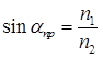 Из закона преломления (4) следует, что при переходе лучей из среды оптически менее плотной в среду оптически более плотную, например, из воздуха в воду, а также из воды или воздуха в стекло и т.д. (n2>n1), углы падения будут меньше углов преломления (a2<a1). С ростом угла падения a1 растет и угол преломления a2. Максимальное значение угла падения равно p/2, поэтому максимальное значение aпр угла преломления найдем из (4):