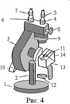 Основной частью рефрактометра является сложная призма (Рис. 3), состоящая из двух призм – осветительной и измерительной (последнюю иногда называют эталонной). Обе призмы изготовлены из стекла – флинт с показателем преломления nD=1,75. В осветительной призме грань АВ – матовая, а в измерительной грань Между этими гранями наносится слой исследуемой жидкости, показатель преломления которой находится в пределах 1,3 – 1,7. Лучи от осветителя, попадая на матовую грань АВ осветительной призмы, рассеиваются ею под разными углами от 0° до 90° и падают на грань измерительной призмы На грани После преломления на другой грани призмы лучи собираются в фокальной плоскости объектива зрительной трубы, и в поле зрения трубы возникает резкая граница света и тени, которая рассматривается в окуляр. Положение этой границы определяется лучами, выходящими под предельным углом aпр или, как следует из формулы (5), показателем преломления исследуемой жидкости. При совмещении границы света и тени с перекрестием окуляра зрительной труба, по шкале прибора делается отсчет показателя преломления nD. Общий вид рефрактометра представлен на рис. 4. На основании 1 установлена стойка 2, к которой крепится корпус прибора 3. На корпусе укреплены зрительная труба 4 с окуляром 5 и микроскоп 6 с окуляром 7. Внутри прибора находится компенсатор для устранения дисперсионной окраски границы света и тени. С ним связана рукоятка 8. По лимбу 9 берется отсчет для определения дисперсии. Основная часть прибора – камера, состоящая из двух призм 14 и 13, связанная с рукояткой 10, вращающей камеру. Камера закрывается замком 11. Свет на входную грань осветительной призмы 13 направляется зеркалом 12. Источником света служит лампа накаливания.