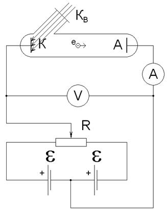 Явление вырывания электронов с поверхности вещества (металлов) под действием света (электромагнитного излучения) называется внешним фотоэффектом или явление вырывания электронов из твердых и жидких тел под действием света называют внешним фотоэлектрическим эффектом (или просто фотоэффектом), а вырванные таким образом электроны – фотоэлектронами. Внутренний фотоэффект – это явление увеличения электропроводности диэлектриков и полупроводников под действием света. Впервые явление фотоэффекта было замечено Г. Герцем в 1887 г. Сущность явления состоит в том, что при освещении металлическое тело теряет электроны. Первые количественные исследования фотоэлектрического эффекта принадлежат русскому физику А.Г. Столетову, который установил основные законы фотоэффекта. Для более полного представления о фотоэффекте проведены экспериментальные исследования, которые состоят в следующем. Свет, проникающий через кварцевое окно К в, освещает катод, изготовленный из исследуемого материала. Электроны, испущенные вследствие фотоэффекта, перемещаются под действием электрического поля к аноду А. В цепи возникает фототок, измеряемый гальванометром Г. С помощью потенциометра П можно изменять напряжение между катодом и анодом, которое показывает вольтметр V (рис. 1).