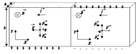 Рис. 1 Если пластина изготовлена из металла, то носителем тока является электрон – отрицательно заряженная частица. В этом случае схема возникновения эффекта Холла соответствует рис. 1, б. Для этого случая, в равновесном состоянии, сила Лоренца компенсируется электрической силой возникающей за счёт индуцированных зарядов. Тогда предполагая, что поле индуцированных зарядов однородно получим: