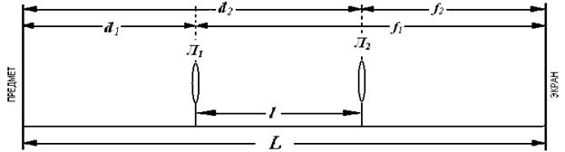 то найдутся такие два положения линзы Л1 и Л2, при которых на экране получаются отчётливые изображения, в одном случае увеличенное, в другом - уменьшенное. Обозначим для одного положения линзы (Л1) расстояния от неё до предмета и экрана через d1 и f1, а для другого - через d2 и f2. Так как расстояние между предметом и экраном остаётся при перемещениях линзы постоянным, то