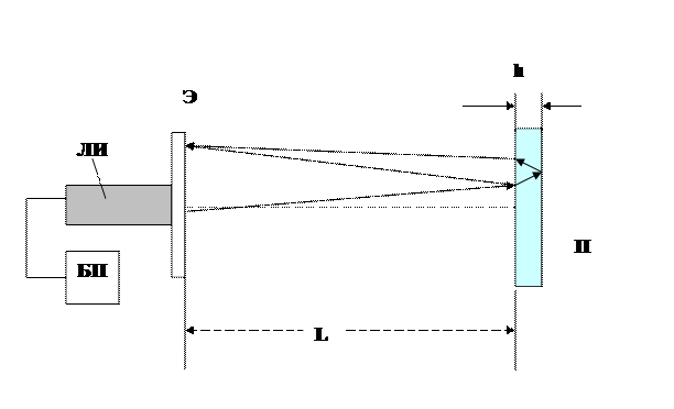 Рис. 1. Схема экспериментальной установки. БП – блок питания He-Ne лазера, ЛИ – лазерный излучатель, Э – экран, П – толстая стеклянная пластина.