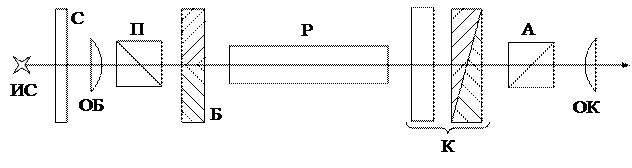 Рисунок 2 - Оптическая схема сахариметра. ИС - источник света, С - светофильтр, ОБ - объектив, П - поляризатор, Б - бикварц, Р - трубка с раствором сахара, К - компенсатор, А - анализатор, ОК – окуляр.