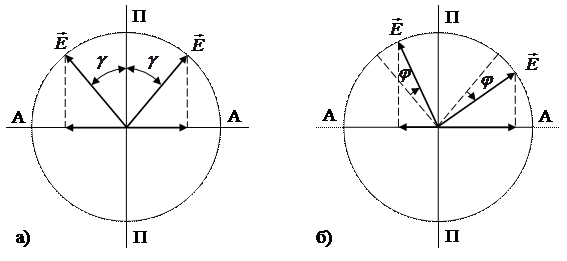 Рисунок 3 - Поворот плоскости колебаний света в сахариметре: а) без раствора сахара; б) с раствором сахара. П-П и А-А - плоскости главных сечений поляризатора и анализатора.