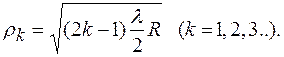 Радиусы световых колец Ньютона в отраженном свете определяются по формуле: