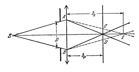 На экране (Рис. 2) изображение источника будет иметь форму пятна, края которого окрашены в красный цвет. Диаметр пятна d можно найти из подобия треугольников АВЕ и CDE: