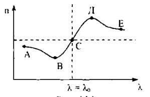 38. На графике (Рис. 3) зависимости показателя преломления вещества n от длины световой волны 1) АВ. 2) ДЕ. 3) ВС и СД. 4) АВ и ДЕ. 5) СД. 39. На графике (Рис. 4) зависимости показателя преломления вещества n от частоты 1) АБ. 2) ДЕ. 3) БД. 4)АС. 5) СЕ.