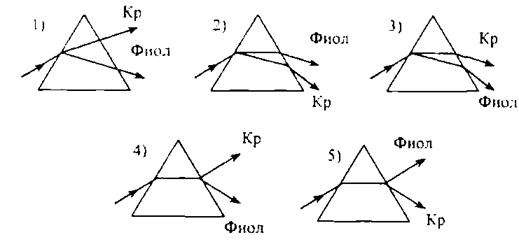 40. На какой из схем (Рис. 5) правильно представлен ход лучей при разложении пучка белого света стеклянной призмой?