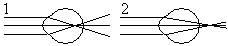1) 1 и 5 2) 3 и 6 3) 3 и 5 4) 3 и 4 /4/ 2. Линза оптической силой +2 дптр 1) дает увеличенное в 2 раза изображение 2) дает уменьшенное в 2 раза изображение 3) это собирающая линза с фокусным расстоянием 2 м 4) это собирающая линза с фокусным расстоянием 0,5 м /4/ 3. Линза оптической силой -2 дптр 1) дает увеличенное в 2 раза изображение 2) дает уменьшенное в 2 раза изображение 3) это собирающая линза с фокусным расстоянием 2 м 4) это рассеивающая линза с фокусным расстоянием 0,5 м 4. На рис. – схемы хода лучей в глазе при близорукости и дальнозоркости. Какая схема соответствует близорукости? Какие линзы нужны для очков в этом случае? Ответьте на этот же вопрос для дальнозоркости.