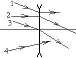1) 1 2) 2 3) 3 4) для всех трех предметов 6. Какому оптическому прибору (лупа, проекционный аппарат, объектив фотоаппарата, очки близорукого человека) соответствует ход лучей через линзу на рисунке? А) Б) В) Г) 7. На рис. – ход лучей в рассеивающей линзе. Ход какого из лучей соответствует законам геометрической оптики?