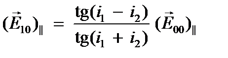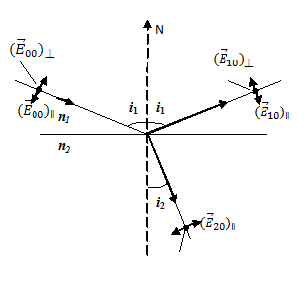 Рис.9.1. Падение света на границу раздела двух сред Падающую волну можно представить суперпозицией двух линейно поляризованных волн с взаимно перпендикулярными плоскостями колебаний: в одной из волн плоскость колебаний совпадает с плоскостью падения, в другой – перпендикулярно ей. Напряжённостям полей в таких волнах соответствуют индексы () и ( Формулы Френеля выглядят следующим образом