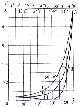 Рис.9.2. Коэффициент отражения света в функции угла падения Кривая II (I отр/ I пад) проходит между ρ|| и ρ┴, совпадая с ними в точках φ =0 и φ =π/2. На этом рисунке показан средний коэффициент пропускания I пр/ I пад. Из формул (9.1) и (9.2) видно, что при (i 1+ i 2) = π/2 коэффициенты отражения ρ||=0, ρ┴≠0. Следовательно, в этом случае отражённая волна линейно поляризована в плоскости, перпендикулярной плоскости падения. Преломлённая волна поляризована частично. При (i1+i2)=π/2 соотношение tgi1= tg iБ = n21 (9.3) Равенство (9.3) определяет угол падения, i 1= i Б при котором коэффициент отражения ρII=0. Этот угол называется углом Брюстера. Date: 2015-05-08; view: 784; Нарушение авторских прав |