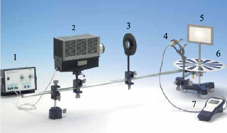 Рис.17.5. Внешний вид установки для проверки закона Ламберта. 1 – блок питания галогеновой лампы; 2 – осветительная галогеновая лампа в корпусе с конденсором; 3 – линза в держателе; 4 – измерительная головка люксметра; 5 – сульфидо-цинковый экран; 6 – диск с градуировкой; 7 – измерительный модуль люксметра.