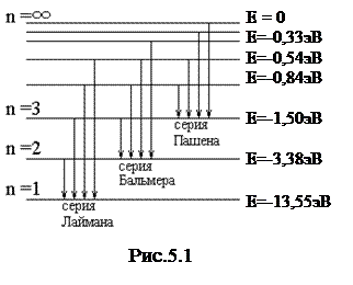 Спектр атома водорода по Бору. Постулаты Бора позволили рассчитать спектр атома водорода и водородоподобных систем – систем, состоящих из ядра с зарядом Z∙e и одного электрона