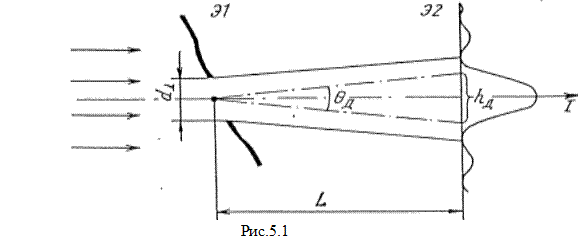УГОЛ ДИФРАКЦИИ Пусть отверстие в экране Э1 «вырезает» пучок из плоской монохроматической волны (рис.5.1), и след пучка наблюдается на экране Э2. Уменьшая размер отверстия, заметим, что вначале размер следа пучка уменьшается в соответствии с размером отверстия, но затем начинает увеличиваться: пучок становится расходящимся. Угловая ширина пучка (угол дифракции qд) определяется соотношением между длиной волны l и характерным размером пучка d в плоскости, перпендикулярной направлению распространения волны: qд ~ l/ d (5.1) Соотношение (5.1) позволяет оценить порядки дифракционных эффектов. Смысл его в том, что любое пространственное ограничение волны вызывает её расхождение в соответствии с (5.1). Если вместо экрана Э1 с отверстием в пучок излучения вносится препятствие размером d, то расходящийся дифракционный пучок наблюдается на фоне незакрытого «прямого» пучка. ДЛИНА ДИФРАКЦИИ Вследствие дифракционной расходимости размер освещенной области на экране Э2 будет превышать начальные размеры пучка d. Дополнительное дифракционное уширение h д = L qд (5.2) Если h д < df, то размер пятна практически равен d, а распределение интенсивности определяется законами геометрической оптики. Расстояние qд, на котором дифракционное уширение становится сравнимым с начальным размером пучка, называют длиной дифракции. Из условия L дqд ~ d находим: L д ~ d 2 / l (5.3) Если выполняется записанное в различных формах условие L < L д; l < d 2/ L; d > то «работает» геометрическая оптика. Если же L ³ L д; l ³ d 2/ L; d ³ то существенно явление дифракции. При L > L д размер пятна h д > d, и распределение интенсивности полностью определяется дифракцией. Характер распределения интенсивности в дифракционной картине зависит от отношения длины дифракции L д к расстоянию от экрана L до плоскости наблюдения, т.е. от безразмерного параметра дифракции. m = L д/ L = d 2 /l L (5.6)