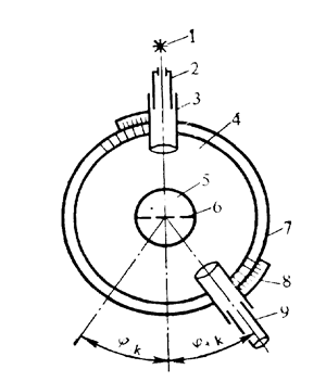 Основными элементами экспериментальной установки (рис. 5) являются источник света 1, гониометр 4 и дифракционная решетка 6. Излучение лампы освещает щель 2 коллиматора 3 гониометра и дифракционную решетку, установленную в держателе 5 перпендикулярно падающим лучам. Зрительную трубу 9 гониометра можно поворачивать вокруг вертикальной оси. В фокальной плоскости окуляра зрительной трубы наблюдается дифракционная картина. Внутри зрительной трубы протянута в вертикальном направлении нить. Нить должна быть отчетливо видна. Наводка на резкость достигается перемещением вдоль оптической оси только окулярной лупы. Угловое положение зрительной трубы определяют по шкале 7 и нониусу 8 гониометра. Поскольку начало отсчета по шкале гониометра может не совпадать с направлением нормали к поверхности решетки, угол дифракции j определяется разностью двух углов (a-a0) где a0, - угол, определяющий положение центрального (K=О) неокрашенного дифракционного максимума, а a - угол, определяющий положение максимума К-го порядка.