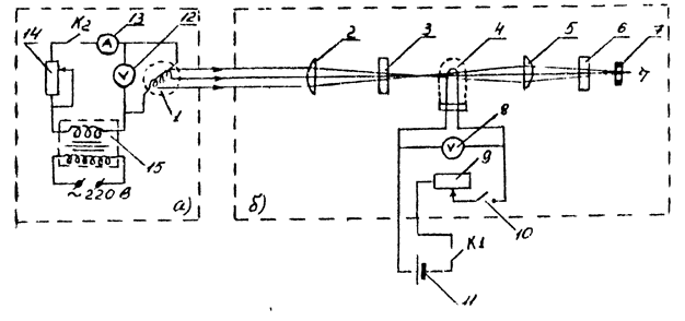 Основной частью пирометра является пирометрическая лампа 4 с дугообразной нитью, расположенной в фокусе объектива 2. Этот же объектив фокусирует лучи, идущие от