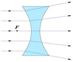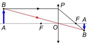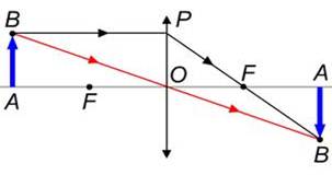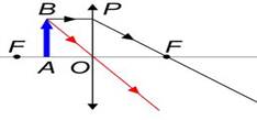 Лінзу, що пере-творює паралельний пучок променів у розбіжний, називають розсіювальною. 7. Утворення зображень за допомогою лінзи. Обладнання: збиральна лінза, розсіювальна лінза, джерело світла, екран. Направимо на двоопуклу лінзу, паралельно до головної оптичної осі, декілька пучків світла. Заломившись на поверхні лінзи, пучки світла перетнуться в точці F, яка називається головним фокусом лінзи. У кожної лінзи є два фокуси – по одному з кожного боку лінзи. Точку О, яка лежить на оптичній осі в центрі лінзи, називають оптичним центром лінзи. Відстань від оптичного центра лінзи О до головного фокуса F називають головною фокусною відстанню лінзи; її також позначають буквою F. Дивитись рис. вище. У розсіювальної лінзи також є фокус, тільки він уявний. Якщо розбіжний пучок променів, які виходять з такої лінзи, продовжити в бік, протилежний їхньому напряму, то продовження променів перетнуться в точці F, що лежить на оптичній осі з того боку, з якого падає світло на лінзу. За допомогою лінз можна не тільки збирати і розсіювати промені світла, а й утворювати різні зображення предметів. Завдяки цій властивості лінзи широко використовують на практиці. Для побудови зображень у лінзах достатньо двох променів. Перший промінь проходить паралельно оптичній осі лінзи, другий, проходить через її центр. Перший промінь, пройшовши крізь лінзу, перетне її оптичну вісь у фокусі, другий пройде крізь лінзу, не змінюючи свого напрямку.
