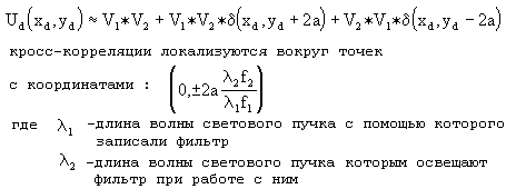 представляющий собой кросс-корреляцию сигналов v и U. Если v = U, то получают функцию автокорреляции. Операционный фильтр с передаточной функцией H=V называют согласованным фильтром, а соответствующую схему - схемой согласованной фильтрации. Согласованная фильтрация обычно используется при распознавании образов в заданном изображении: отдельных букв, символов, простых рисунков специальной информации. Для этого записывают (одним из методов) фильтр, согласованный с образом информации, подлежащим опознаванию, после чего осуществляют его взаимную корреляцию с заданным изображением. Если в изображении содержится интересующий образ, то в результате автокорреляции в выходной плоскости системы образуется яркое световое пятно, указывающее на наличие опознаваемого образа и местонахождение в искомом изображении. Таким путем распознают отпечатки пальцев, интересующие слова на странице текста, специальные объекты на карте местности и т.п. В коррелятор с одновременным преобразованием функции V1(x,y) и V2(x,y), корреляцию которых требуется получить, вводятся с помощью транспарантов, помещенных рядом во входной плоскости. Допустим, что каждая функция имеет ширину а, а расстояние между центрами функций равно 2а. Амплитудное пропускание транспарантов можно записать в виде