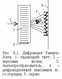 Физическая интерпретация этих двух различных типов дифракции состоит в следующем. При неизменной длине волны света на низких звуковых частотах при малой длине взаимодействия (длине акустического столба) направление распространения падающего света внутри области взаимодействия остается прямолинейным, и оптическая неоднородность среды, связанная с изменением показателя преломления, влияет только на фазу света, прошедшего через акустический столб. Для света роль акустической волны в этом случае сводится к созданию движущейся со скоростью звука фазовой решетки с периодом, равным периоду звуковой волны. Такая ситуация соответствует дифракции Рамана - Ната. Дифракция света в режиме Рамана - Ната происходит по законам дифракции на обычной фазовой решетке, и именно этим объясняется наличие симметричных эквидистантно расположенных дифракционных максимумов. Частоты света в дифракционных максимумах сдвинуты согласно эффекту Допплера вследствие движения фазовой решетки.