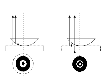 Классическим примером полос равной толщины являются кольца Ньютона. Изучение интерференционной картины в виде колец Ньютона является наиболее простым методом исследования этого явления и определения длины волны. Этот метод может быть использован для измерения углов тонких стеклянных клинов и радиуса кривизны линз, определения профилей несферических поверхностей, а также величины деформации изделий из любого прозрачного материала. Кольца Ньютона наблюдаются в том случае, когда выпуклая поверхность линзы малой кривизны соприкасается с плоской поверхностью хорошо отполированной пластины (рис.4.4). При этом оставшаяся между ними воздушная прослойка постепенно утолщается от центра к краям. Кольца Ньютона можно наблюдать как в отраженном (рис.4.4а), так и в проходящем (рис.4.4б) свете.