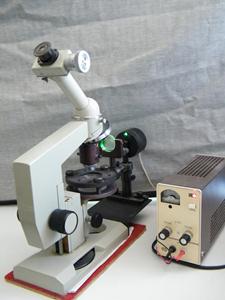 Экспериментальная установка состоит из микроскопа, на предметном столике которого крепятся оптическая система, состоящая из стеклянной пластинки и прижатой к ней линзы. Оптическая схема установки представлена на рис. 4.6. Источником света служат светодиоды, обладающие квазимонохроматическим излучением. Интерференционная картина наблюдается в поле зрения объектив-микрометра 8, при помощи которого измеряются диаметры интерференционных колец.