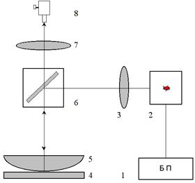Рисунок 4.6 — Блок-схема лабораторной установки для изучения колец Ньютона 1 — источник питания блока светодиодов; 2 — блок светодиодов — источник квазимонохроматического излучения; 3, 7 — линзы; 4 — стеклянная плоскопараллельная пластинка; 5 — плосковыпуклая линза; 6 — светоделительное устройство; 8 — объектив-микрометр.
