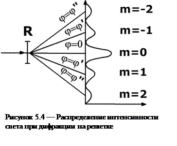 где m — порядок спектра, φ — угол дифракции. В направлениях, не удовлетворяющих соотношению (5.2), наблюдаются темные полосы. В результате дифракционная картина представляет собой чередование темных и светлых полос. При На некотором расстоянии от главного максимума расположены максимумы первого порядка (m =