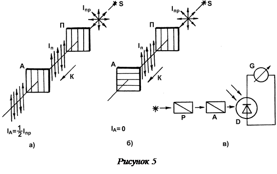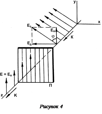 Отже, у будь-якому поляризаторі існує виділений напрямок, який називається площиною пропускання або головною площиною поляризатора, такий що світло, лінійно поляризоване у площині, паралельній цьому напрямку, проходить крізь поляризатор без поглинання, а світло, поляризоване у площині, перпендикулярній до цього напрямку, поглинається у поляризаторі повністю. Закон Малюса: якщо плоскополяризоване світло інтенсивністю І0 падає на поляризатор П так, що площина коливань вектора Е складає кут j з площиною пропускання поляризатора (рисунок 4), то інтенсивність світла І після проходження поляризатора