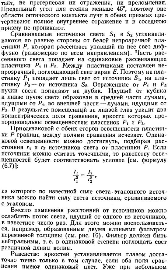 Световые величины.Энергитические характеристики Являются малопригодными для описания восприятия света газом, т.к. чувствительность глаза к одинаковым потокам излучения с разной λ неодинакова и, кроме того, с помощью глаза нельзя установить абсолютное значение потока излучения, а только определить равенство освещенности двух областей поля зрения. Для проведения таких сравнительных экспериментов применяют фотометр. Варьируя расстояние до источников можно уравнять освещенности: