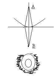 Если размер экрана мал то действие 1-ой открытой зоны почти не отличается от действия центральной зоны волнового фронта. Таким образом, освещенность в В будет ≈ такой же как и в отсутствии экрана. Вследствие симметрии относительно АВ светлая точка в В окружена кольцевыми зонами тени и света (вне границ геометрической тени). в) Дифракция на краю полубесконечного экрана.