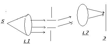 Такой тип дифракции можно рассматривать математически до конца. Помещая между линзами разные экраны, мы меняем характер дифракционной картины, являющейся изображение источника. Дифракция на щели.