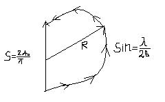 Окончательное значение амплитуды в В будет в скобках выражение>0. поэтому Так как Но это не означает, что если на линии АВ поместить небольшой экран, то до В свет не дойдет. Например, если закрыть 1-ую зону, то выпадет 1- ый член ряда и окажется Если размер отверстия в непрозрачном круглом экране такой, что открытым остается четное число зон, то S→0 и в В будет «темнота». Изменение диаметра к периодическому усилению и ослаблению света при проходе от четного к несчетному числу открытых зон. Более того, если перемещать точку наблюдения вдоль прямой АВ начав с расстояния на котором, например отверстие оставляют открытой одну зону и приближаться к экрану, то число открытых зон будет расти, а потому снова должны наблюдаться по переменные переходы от света к темноте. Так как наибольшее значение суммы ряда получается если открыта одна зона, то это можно истолковать как получение изображения точечного источника (камер-обскуры). Полученные результаты можно сделать наглядными при помощи векторной диаграммы. Разобьем первую зону на большое число равновеликих кольцевых зон. Пусть колебания создаваемые частью зоны прилегающей к оси ОА изображаются вектором