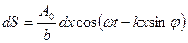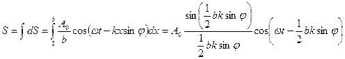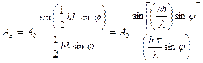 Для аналитического расчета интенсивности света щелью, напишем выражение для волны, посылаемый каждым элементом волнового фронта и просуммируем действие всех элементов. Амплитуда волны от одного элемента ~ его ширине dx, т.е = cdx. Величину с найдем из условия, что в направлении φ=0 амплитуда воны = Для отыскания действия всей щели в направлении φ надо учесть разность фаз, характеризующую волны, доходящие от разных элементов волнового фронта до Проведем плоскость FD перпендикулярно к направлению нормалей дифрагировавших волн. Разность хода от А и от N есть Результирующее возмущение в точке